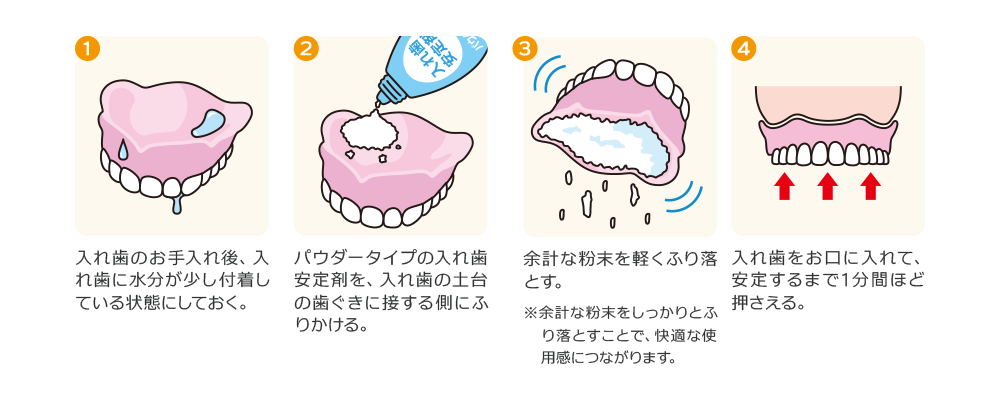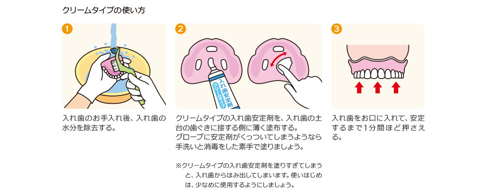 入れ歯安定剤は一時的な補助として使うもので、合わない入れ歯を無理に使い続けると、あごの骨が変形したり、噛み合わせが悪くなったりする原因になることがあります。