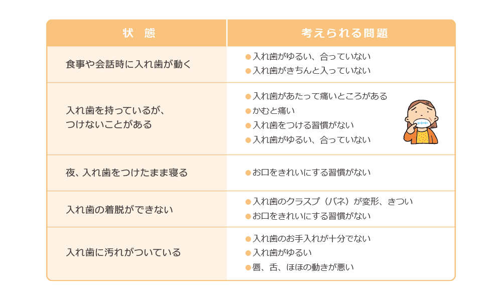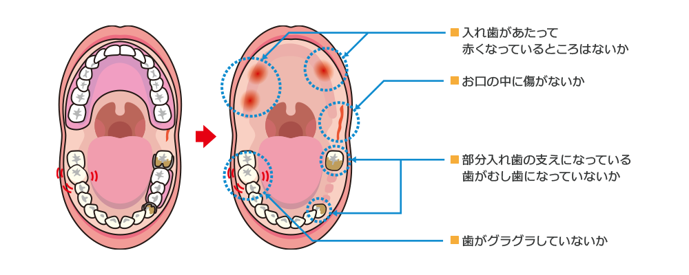 入れ歯の不具合は、入れ歯だけではなくお口の中に問題があることも考えられるため、注意して観察しましょう。