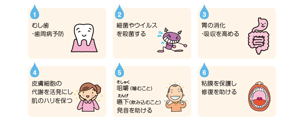 ご高齢の方の多くはだ液の分泌が十分ではなく、お口の中は乾燥しやすくなります。お口の中がだ液でうるおっていないと、食べかすを洗い流す働きが弱くなったり、食べものを飲み込みにくくなります。