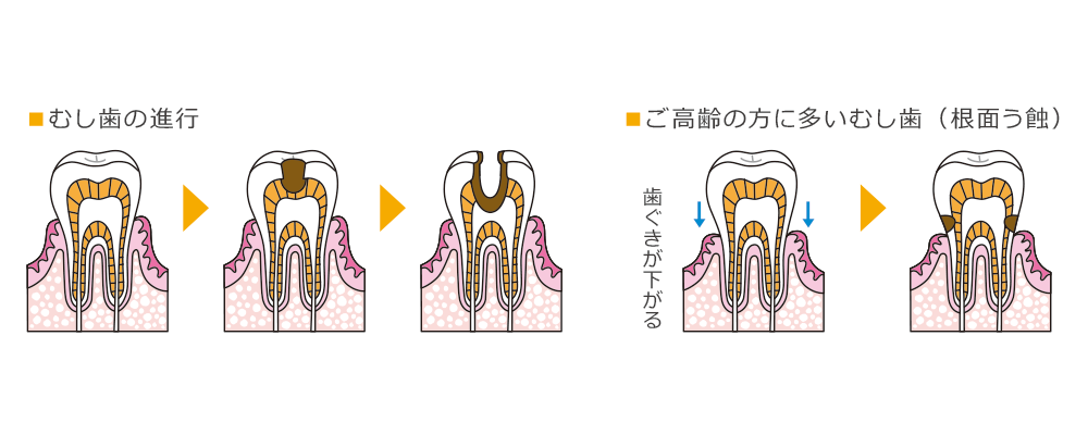 ご高齢の方のお口の中は、特定の部位にむし歯ができやすくなる傾向があります。